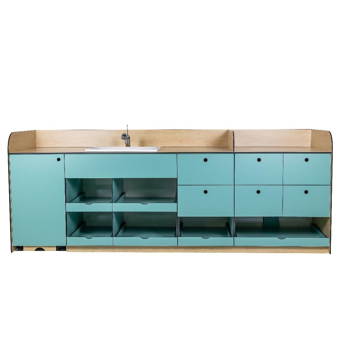À partir de 5900.00 € HTLe meuble de change double aux multiples rangements Nua’Kids offre une ergonomie optimale pour les crèches : escalier coulissant sécurisé, deux espaces de change , une baignoire intégrée, une douchette médicale . Conçu en compact HPL Sanitized®, il garantit une hygiène durable, une robustesse exceptionnelle et accompagne l’enfant et les professionnelles au quotidien.