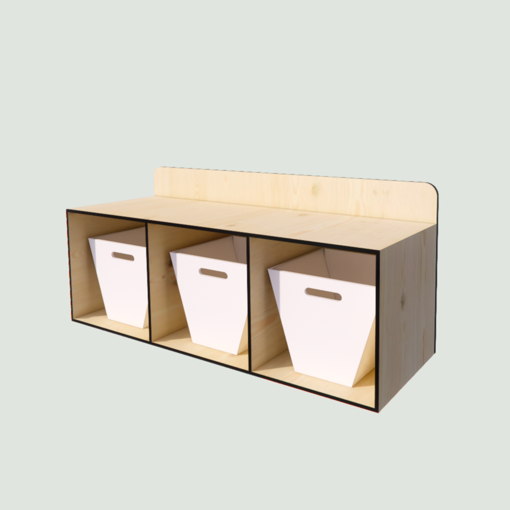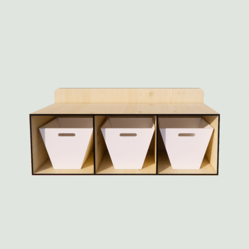 Meuble bas large comprenant 3 casiers pour le rangement ou la présentation des jouets .