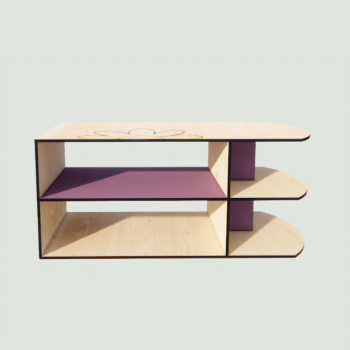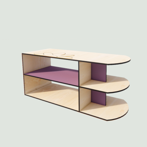 Meuble bas arrondi. Accessible des deux côtés par les enfants, son design arrondi apporte douceur dans la pièce de vie des tout petits.
