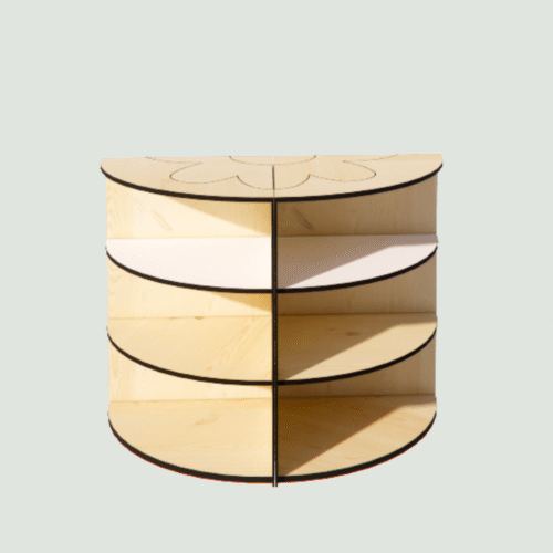 Le meuble bas composé de 2 quarts arrondi et du module niche de la gamme permet de créer un présentoir jouets qui favorise la découverte .