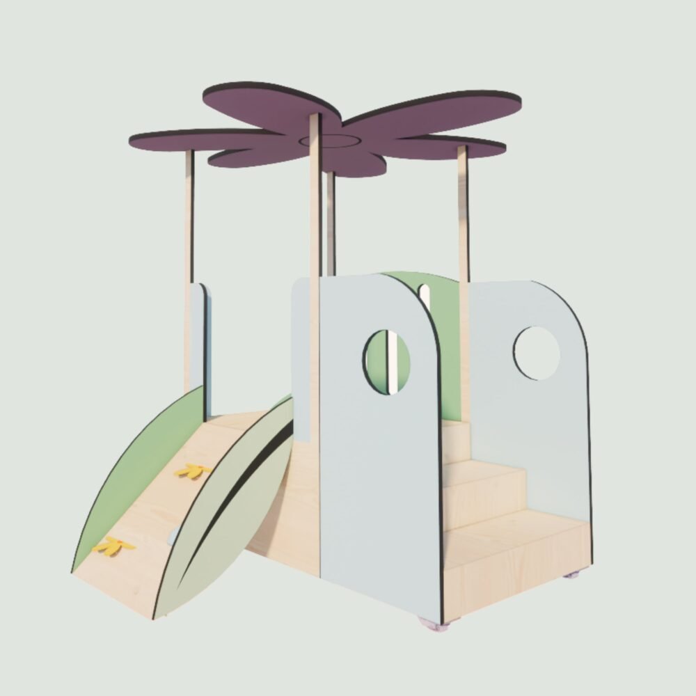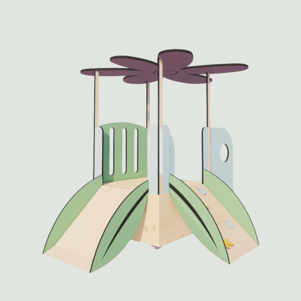 Cette jolie structure montée sur roulettes avec freins combine plusieurs activités motrices dans un format compact et mobile : un petit toboggan, un escalier à deux marches, une montée d’escalade douce, et un grand décor en forme de fleur qui attire l’œil et stimule l’imaginaire.